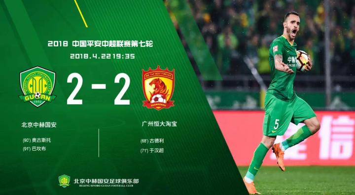 在抵挡住国安的几次猛攻之后,恒大李学鹏断球之后,直接从本方半场左路斜传至中场右路,虽有快速转移到国安半场的左路,简简单单两次传递,国安整条防线在对手的快速拉扯下失去阵型,当李学鹏在左路起球传中时,国安整条后防线都处于疲于奔命的状态,无暇盯人,古德利、于汉超、郜林,三名射术极佳的恒大球员占据了禁区内绝佳的射门位置,最终由后点的古德利抢射破门;占据优势却又先失一球,国安在随后的几分钟里出现精神涣散,又被对手前场抢断打进一球。国安很快便重复了上半场后半段的故事,拿不到球、射不了门。如果恒大能够保持这个节奏,从工体带走三分只是时间问题。