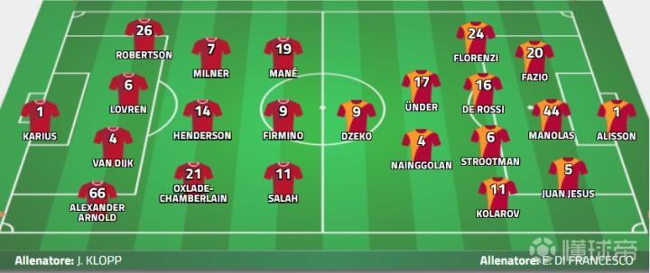 该媒体认为罗马会使用三中卫阵型,和逆转巴萨的3-5-2不同,本次迪弗朗西斯科将采用3-4-3(哲科突前变为3-4-2-1)阵型,纳因戈兰前移,云代尔首发出战,希克替补。利物浦方面萨拉赫战旧主,张伯伦、亨德森均首发出战。