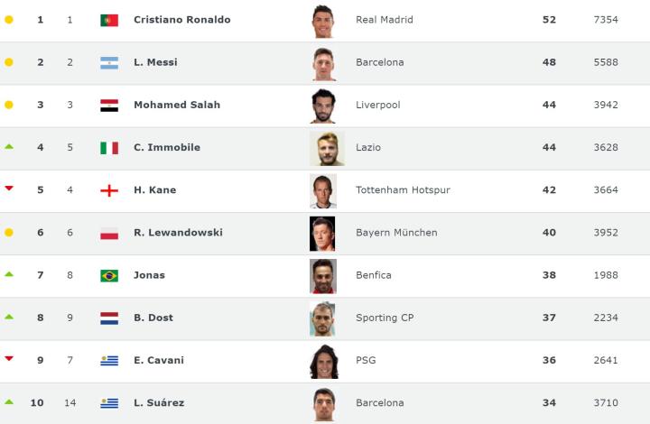 足球数据网站"clubworldranking"更新了最新一期的世界射手排名,前3名依然是C罗、梅西、萨拉赫,凯恩下降至第5,苏亚雷斯杀进前10。苏宁前锋博阿基耶跌出前10,武磊依旧排在第16。