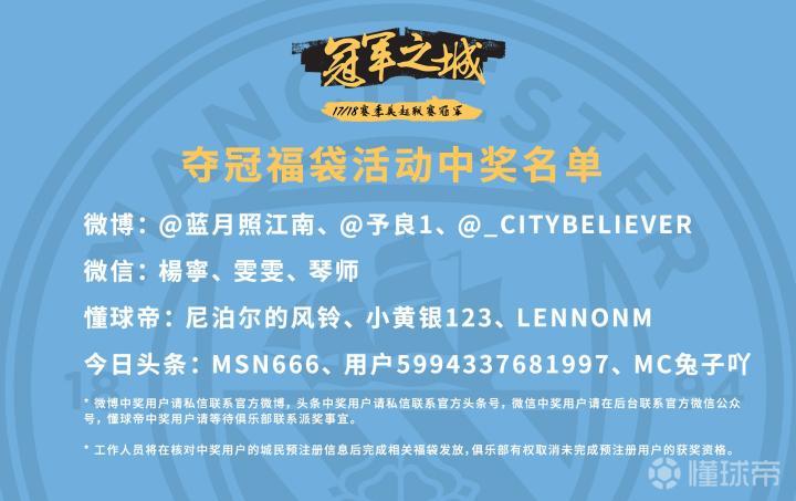 曼城夺冠福袋活动中奖名单公布,快来看看有没有你吧! 曼城足球俱乐部 cn.mancity.com2018-04-26 20:55恭喜懂球帝用户@尼泊尔的风铃 @小黄银123 和 @lennonm 获得曼城夺冠福袋!详情见下图:展开更多