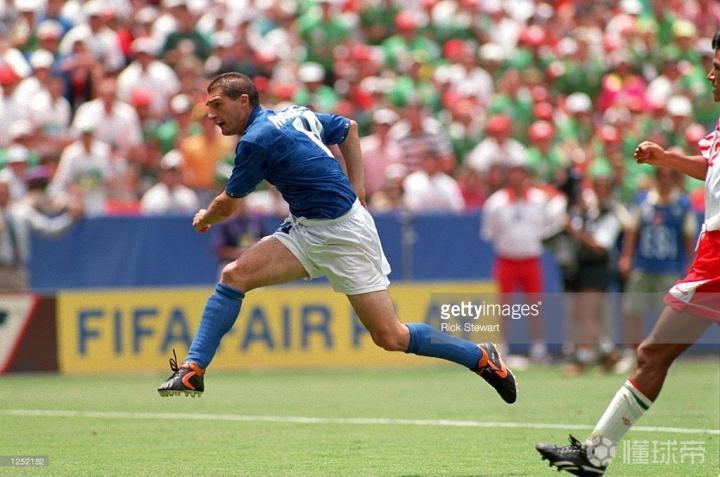 老颜上半部分说adidas nike puma diadora和lotto当时五个比较主流的足球鞋品牌,也说到了1994年世界杯的意大利队,球员使用的足球鞋品牌众多,除了diadora和lotto的足球鞋,意大利队使用的第三多的品牌也是意大利本土品牌,那就是valsport,这个品牌基本都是当时意甲的球员使用,特别是米兰球员,对这个品牌情有独钟,所以1994年世界杯上,米兰的三位大将,马萨罗,塔索蒂和科斯塔库塔,都穿的这个品牌的足球鞋。意大利人的足球鞋,一般颜色都比较花哨,黑色鞋面配搭的颜色比较多,valsport也不例外,1994年世界杯,意大利前锋马萨罗使用的足球鞋,就是黑橙配色。这款足球鞋叫evoluzone,是一款代内靴的中邦足球鞋,这在当时可以说是超级前卫的设计,nike adidas在20年之后才有同样的设计出现。