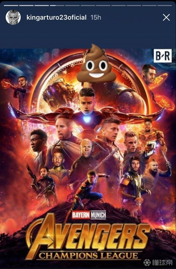 比达尔在个人INS快拍上传了一张照片,恶搞了一张复仇者联盟版的拜仁战皇马海报,他将原本出现海报正上方中央的“灭霸”C罗用代表某种生物排泄物的emoji表情遮挡住。由于比达尔并未附上任何文字说明,对他如此P图的动机我们也无从解释。