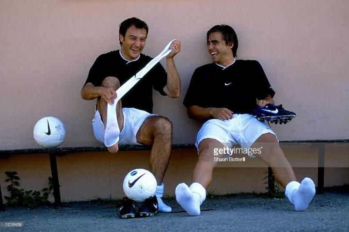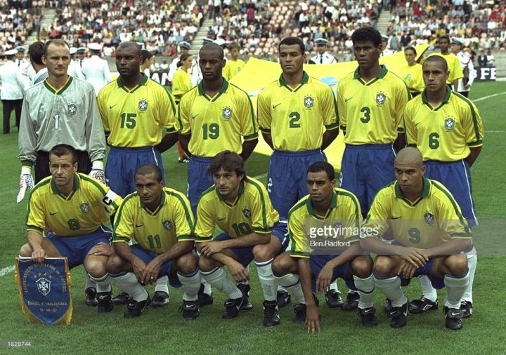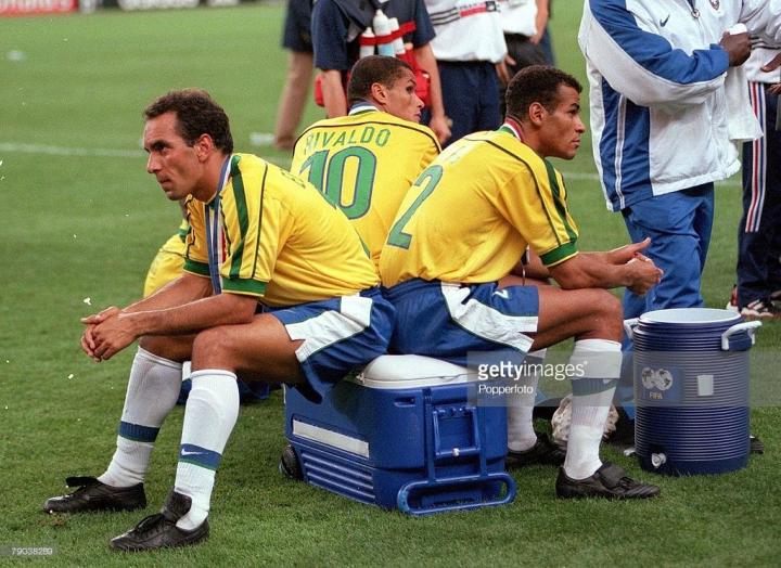 最后再来看一下日后的世界第一右后卫卡福,卡福在1998年世界杯穿的是一双小黑鞋,埃德蒙多也是,不过埃德蒙多的很明显是mizuno的morelia足球鞋,runbird logo依稀可见,卡福的鞋子则毫无线索,型号我发现了他在1997四国赛使用的巴西品牌Penalty的一双黑色足球鞋,这个品牌的足球鞋不太多见,一般只有南美洲球员使用,我们也无法找到卡福穿的鞋的同款,但是在1998年世界杯上,应该还有其他球员使用该品牌的足球鞋。