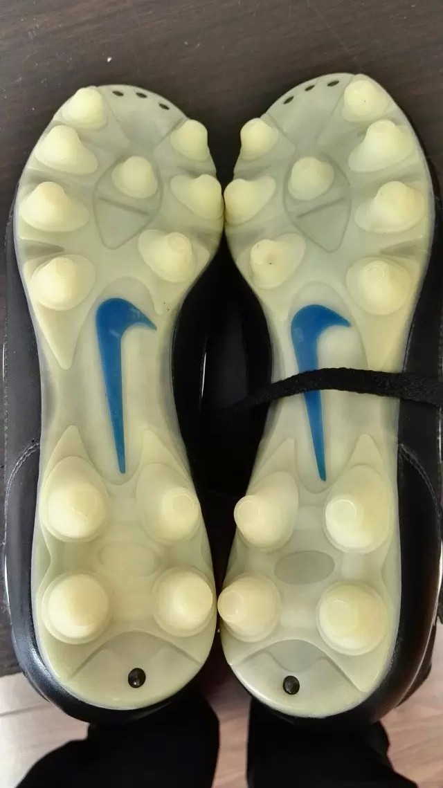 在nike方面,1997年四国赛时还不显山不露水,还在搞暗度陈仓的把戏,所以四国赛上的nike乏善可陈,只有两名球员使用的鞋,可能1998年世界杯不多见,一双是大罗的白鞋钉tiempo premier 3。一般这款鞋是黑色鞋钉,大罗则选择的白钉子,白鞋钉比黑色更粗,也是2000年款tiempo premier e的鞋钉构造。
