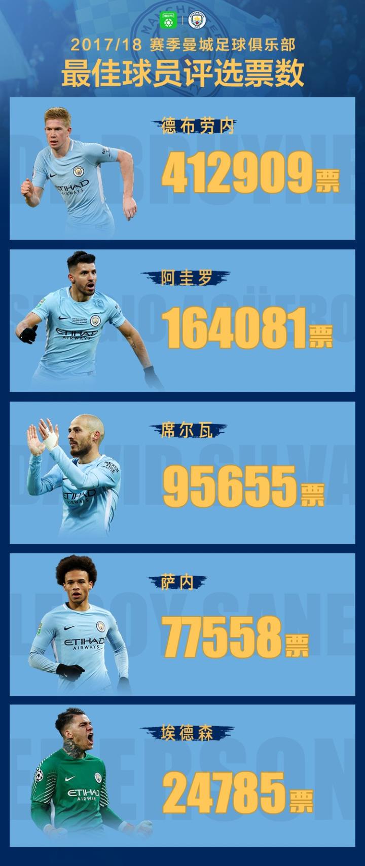经过了5月1日-5日为期4天的投票,懂球帝2017/18赛季曼城最佳球员评选活动悬念揭晓。比利时中场德布劳内以412909票的碾压优势,连续第二年获得该项荣誉。