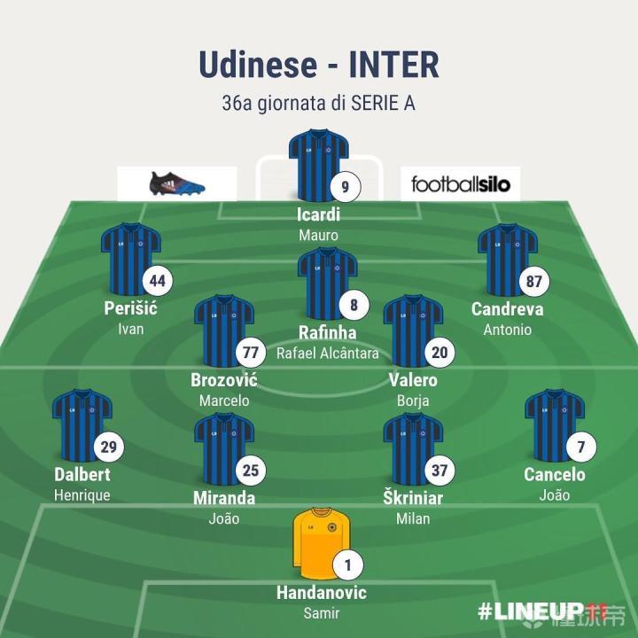 4-2-3-1:汉达诺维奇、达尔贝特、米兰达、什克里尼亚尔、坎塞洛、巴莱罗、布罗佐维奇、拉菲尼亚、佩里西奇、坎德雷瓦、伊卡尔迪
