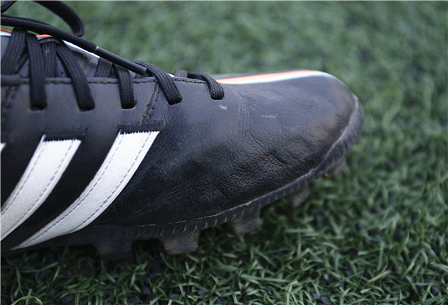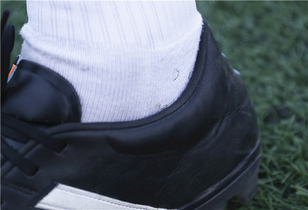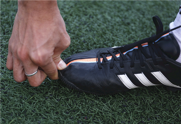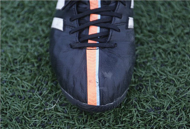 小编个人有个习惯就是每次上场前都要会仔细整理好鞋舌和鞋带(这样感觉脚感会好很多),而这次新11pro让小编非常不爽,因为每次实战过程中鞋舌跑偏非常厉害(如图所示),导致鞋带直接搭在脚背上。这个时候一个有力度的球过来,用脚背去挡或停,或者正脚背发力射门,会有疼痛感,以致在实战中需要多次弯腰调整鞋舌,实在是烦烦烦。