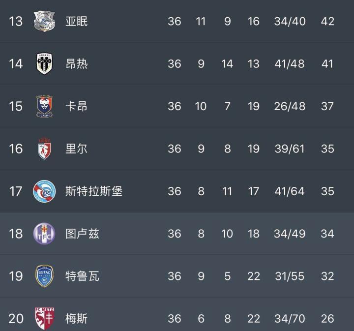 在保级大战中,亚眠在上周末神奇逼平大巴黎后,已经提前上岸。目前,昂热、卡昂、里尔、斯特拉斯堡、图卢兹和特鲁瓦等6支球队,还要在最后两轮比赛中未保级而战。而梅斯,在连续输给保级对手卡昂、里尔和昂热之后,已经提前降级。
