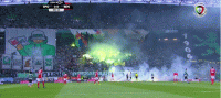 比赛开始后,不断有葡萄牙体育的球迷向场内投掷绿色的火焰棒,主队一侧的禁区内,完全被烟雾笼罩,比赛也一度中断。差不多4分钟之后,比赛才重新开始。第8分钟,本菲卡差点打破僵局,游弋到右路拿球的希门尼斯,将球长传转移到左路。面对紧贴防守的皮奇尼,拉法-席尔瓦突然起速,并赶在帕特里西奥触球前打门,皮球不偏不倚地击中了远端立柱,主队逃过一劫。