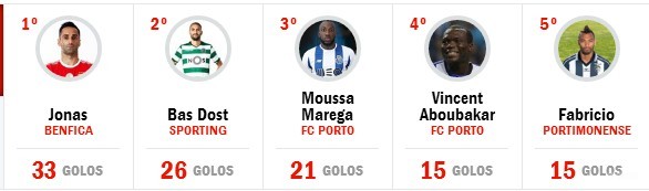 若纳斯、多斯特、马雷加和阿布巴卡尔都没有进球,所以射手榜的前4位没有任何变化。而有1球进账的法布里西奥则升至第5位。