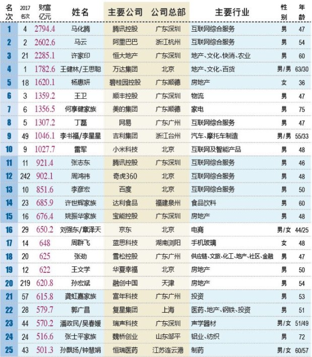 河北华夏幸福的老板王文学以622亿元排名第19位,武汉卓尔老板阎志则以476.6亿元位居第29名。苏宁集团的张近东以接近400亿的财富排名第37。