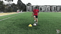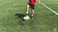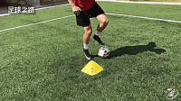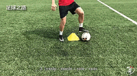 用管用脚轻推至标志盘前,然后用脚尖横拨至标志盘一侧,换脚用脚尖回拉身前,最后用脚内侧将球横拨至另一只脚。