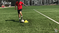 现用脚尖回拉至身前,然后用同一只脚将球拨向标志盘一侧,用脚内侧轻推至标志盘前,换脚再将球拉回身前,脚外侧横拨,脚内侧前推。