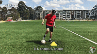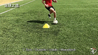 这个动作有点难度,首先用脚尖将球轻挑过标志盘,立刻用脚尖将球点住,做一个L型拨球转身90度,紧接着做一个横拉踩单车的动作,然后在将球回拉至身前,挑球过标志盘重复以上动作。