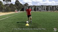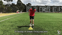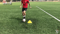 我们用由脚外侧向标志盘一侧拨球,然后立刻变换脚型用脚内侧向前推球,再用脚尖将球横拉,最后用脚尖回拉到身前,通过拨球、推球、横拉、回拉让球让标志盘转一圈。