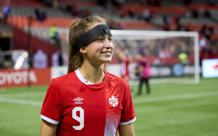 (去年11月9日,她曾身穿9号球衣代表加拿大女足出战与美国女足的比赛,尽管在比赛中不慎受伤,但依旧笑着面对比赛)