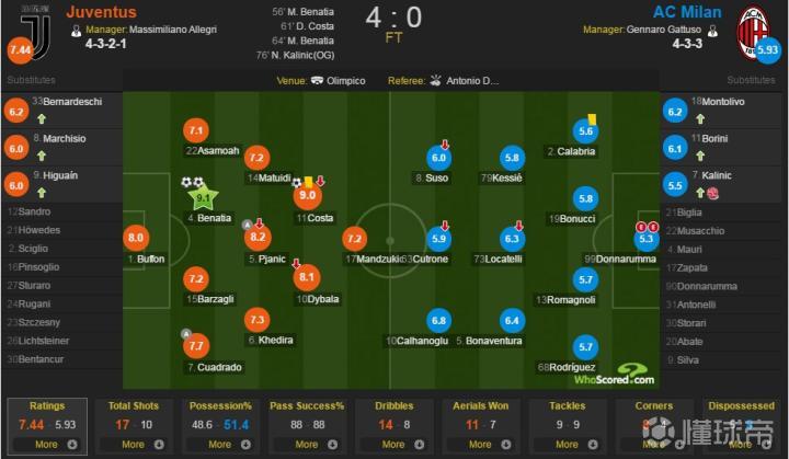 科斯塔的右移、迪巴拉的不断内切或前插、夸德拉多的后排随时准备,尤文将自己场上阵容中所有的爆破力量集中在进攻右路。这样的三爆点三快马组合,显然对米兰的左后卫——本来就不具备速度对抗优势的里卡多罗德里格斯形成了巨大的压力。