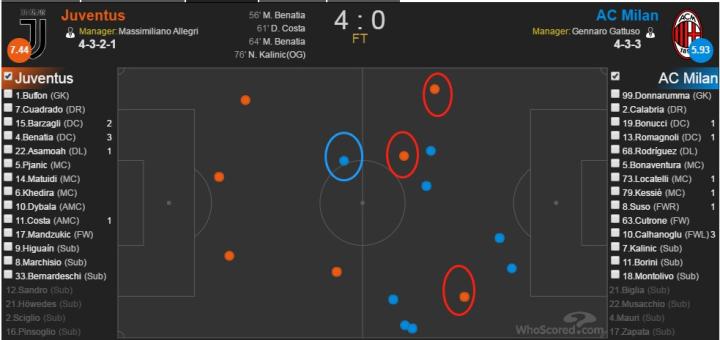 米兰曾经通过恰尔汗奥卢和库特罗内在尤文肋部区域做出连续的倒三角连线并又库特罗内威胁布冯把守的大门,而尤文则通过夸德拉多在右路的起球找到曼朱基奇完成近距离的头球。