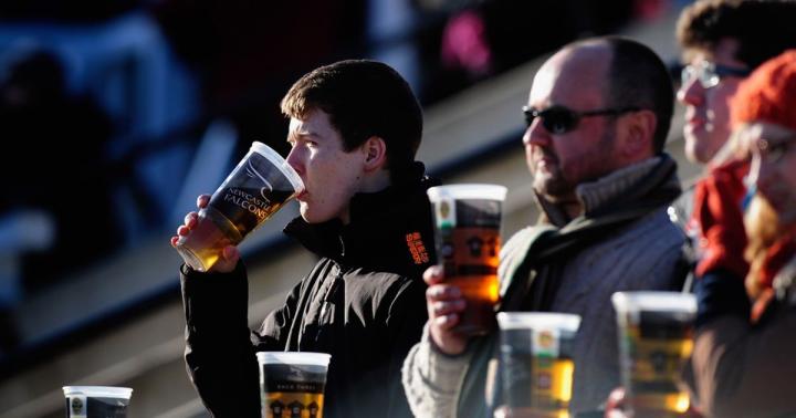 伦敦某队的球迷在看台喝啤酒