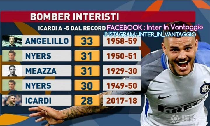 伊卡尔迪已经为国际米兰在联赛打进了99球,距离百球里程碑仅一步之遥,总进球榜已经追上了埃比的106球排在并列第9位,距离联赛进球榜的维埃里还差4球。同样伊卡尔迪距离本赛季射手榜首也只差一球,鉴于因莫比莱很大可能赛季报销,伊卡尔迪或将迎来自己的第二次意甲射手王。这个赛季伊卡尔迪已经打进了28球,排在单赛季进球榜第5位,前四次分别是安杰利诺、梅阿查和尼尔斯创造的。伊卡尔迪目前已经连续四场比赛有进球,追平了个人记录,球迷都在期盼着本场比赛他再创辉煌,加油。