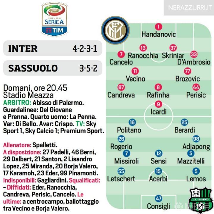 萨索洛在上轮击败桑普多利亚后,已经提前成功保级,这对国际米兰来说是好事,对手不会为保级而死拼了。但萨索洛是国际米兰这几年最不想碰到的对手,有球迷戏称“萨索洛有毒”,一遇到萨索洛都要倒霉,除了前期刷了两次7-0以外,国际米兰对萨索洛是输多赢少,主场对萨索洛已经遭遇两连败,最近6场交锋只赢了1场,双方历史上从来没有打平过,每次交锋都有进球。