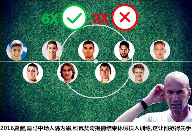 2016年夏天的国际足坛是精彩纷呈的,法国欧洲杯和百年美洲杯遥相呼应,有15名皇马球员在夺得欧冠后稍作休整就奔赴了国家队赛场。硝烟散尽之后,科瓦契奇仅休息不到一周时间就提前归队开始季前训练,与其存在竞争关系的J罗却因不愿缩短美洲杯后的假期与齐达内暗战不断。J罗不能放下身段从小事做起,既是技术特点使然,也是明星心理作祟。相比之下,勇于牺牲自我且服从管教的科瓦契奇更得齐达内器重。在伊斯科取代贝尔成为主力之前,科瓦契奇是中前场配角团中更早上位的成员,齐达内暂时没有将其作为主力使用,而是选择在关键战役中对其委以重任,在出其不意打击对手的同时,帮助克罗地亚人快速完成经验和技能的累积。