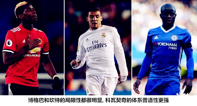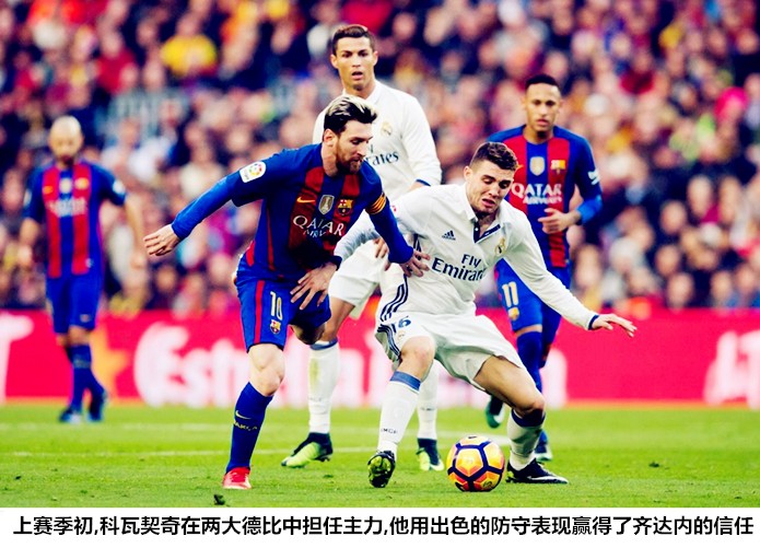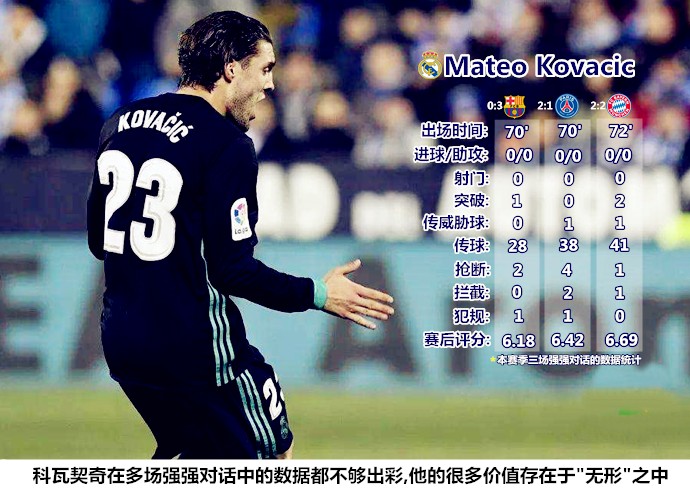 相比克洛普略显教条化的用人方式,齐达内对科瓦契奇的使用则非常讲究,克罗地亚人专门在大多数时间内都被用来专门对付地面流的球队。由于卡塞米罗和克罗斯的受伤,科瓦契奇在上赛季首回合马德里德比和国家德比中获得首发机会,他用出色的表现赢得了齐达内的信任;从本赛季前的两回合西超杯开始,科瓦契奇连续以主力身份参加了首回合国家德比、巴黎的“雾中之战”以及主场对阵拜仁慕尼黑等多场关键战役,其数次贴身盯防梅西以及“打掉”维拉蒂的表现都令人印象深刻。