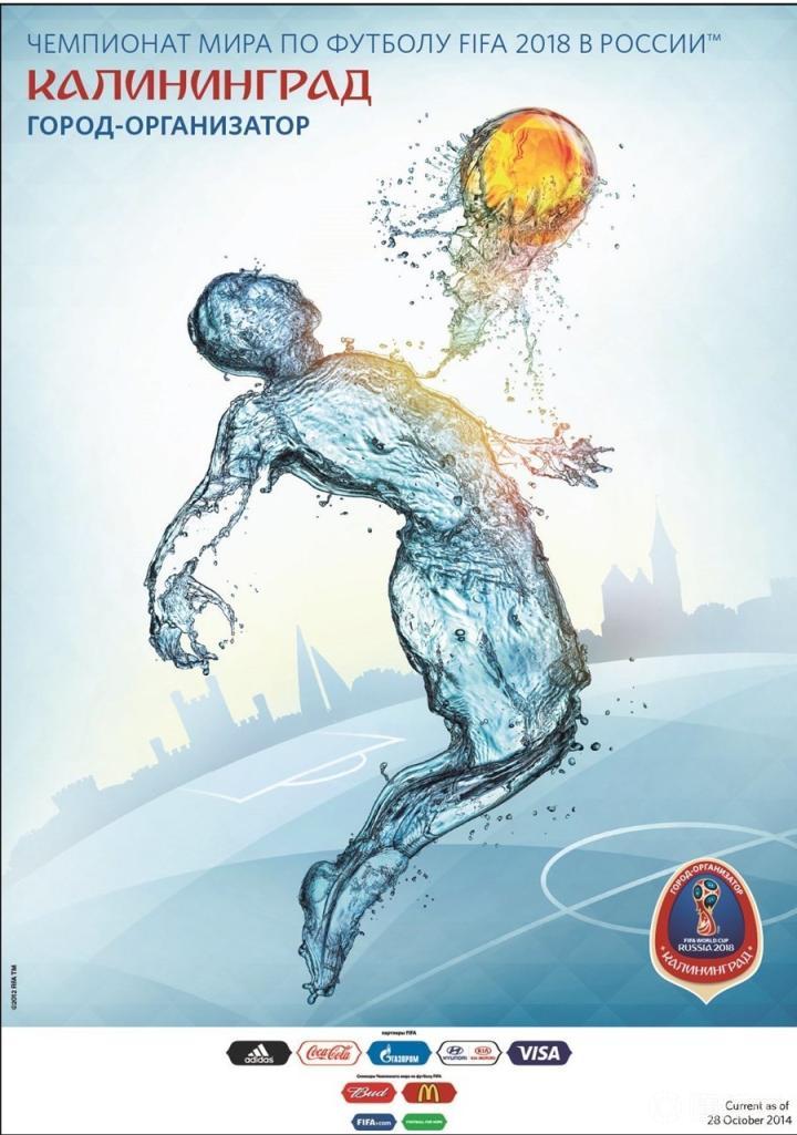 加里宁格勒位于波罗的海岸边的普列戈利亚河入口处,被称为琥珀之地,距离莫斯科1235公里。这张海报上,交织的水花象征着开放和友好,它所采用的琥珀色的足球是世界杯足球赛的象征。在加里宁格勒举办的世界杯将成为一道独特的风景,这座城市不仅有着令人惊讶的过去,还拥有辉煌的未来。