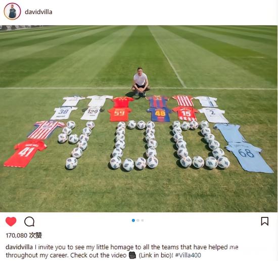 大卫-比利亚也在社交媒体上晒出自己与曾经效力过球队球衣的合影,来纪念自己的新里程碑,而每一件球衣背后印上了所在球队的进球数,并用足球摆出了“400”的字样。