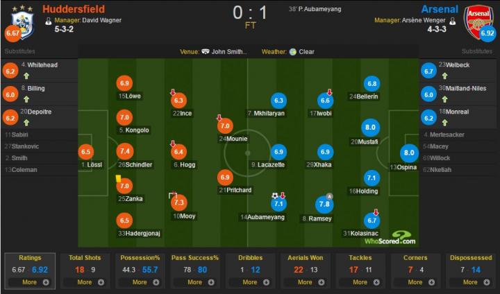 阿森纳首发:13-奥斯皮纳、31-科拉希纳茨(67'18-蒙雷亚尔)、20-穆斯塔菲、16-霍尔丁、24-贝莱林、8-拉姆塞、29-扎卡、17-伊沃比(72'30-奈尔斯)、7-姆希塔良、14-奥巴梅扬(66'23-维尔贝克)、9-拉卡泽特