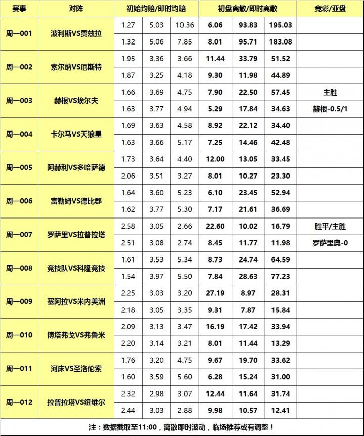 [关于离散] 是竞技彩票特有分析指数,指数基于百家欧赔即时赔率分歧度。基本原理是:百家欧赔平均值与每家赔率差值的绝对值的求和。离散度小则赔率公司观点接近,进而 彩果易打出,离散度大则反之意见分歧大,彩果不易打出。又因庄家操盘/变赔影响,离散低则概率高理论并非放之四海而皆准,需结合盘赔和基本面等信息综合运 用。简言之,离散是参考指标,而非填单依据!以下是各场数据汇总(数据截取至11:00):