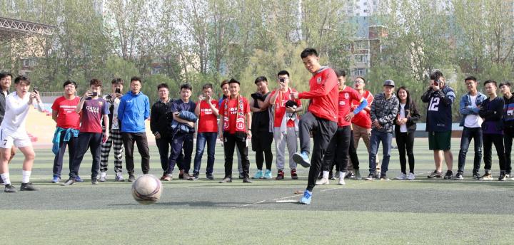 5月10日,“亚泰信差”谭龙在长春工程学院与球迷进行点球大战。