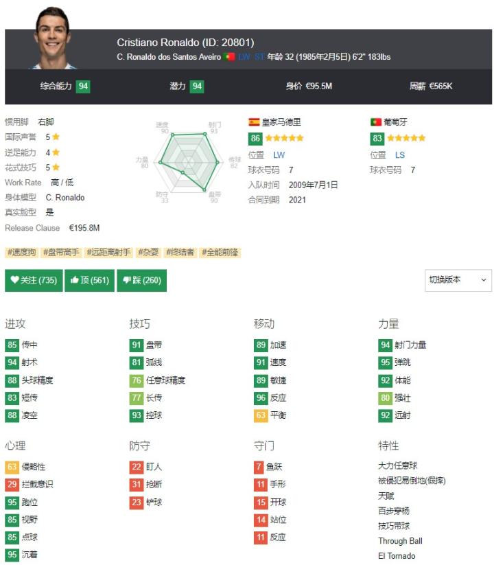 C罗作为游戏中数据最高的一名球员,其各项属性的数值只能用“爆表”来形容。进攻属性上94点的射术和88点的头球都极具威胁,91、93点的盘控展现了C罗极强的技术功底。而尽管已经33岁,但身体属性仍旧是顶级水平,89、91的双速和96点的反应相当恐怖,而96点的弹跳则是其惊人滞空能力的完美体现,92点的体能更是要比大部分球员高出不少。