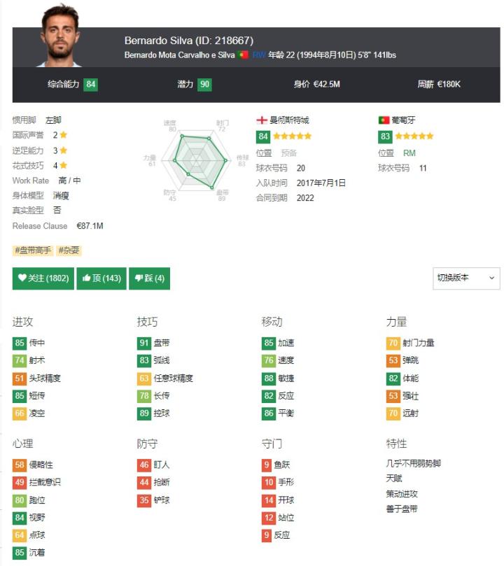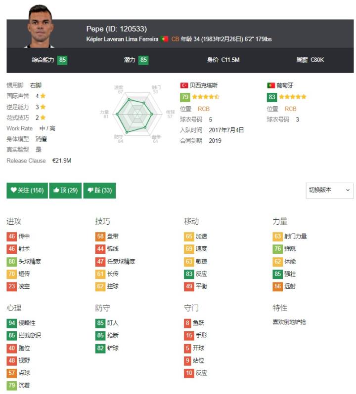 超高的94点侵略性与85点拦截意识让佩佩成为了众多前锋的噩梦,不过较慢的65、69点双速和49点的平衡着实是太低了,很需要搭配一个运动能力较强的后卫来与之配合。力量属性中85点的强壮让他在身体对抗上不会落于下风,而82、85点的铲抢技术和85点的盯人则是佩佩作为中卫的能力所在。