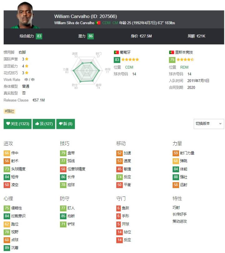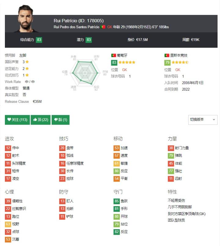 帕特里西奥属于兼具门线技术和反应的门将,而且身体素质相当不错,本赛季更是出战了多达55场比赛。82、85的反应以及鱼跃很出色,能够奉献不少的神扑。此外81点的手型和79点站位也还尚可,配上团队型球员点特性使得他能够很好地指挥球队的后防线。