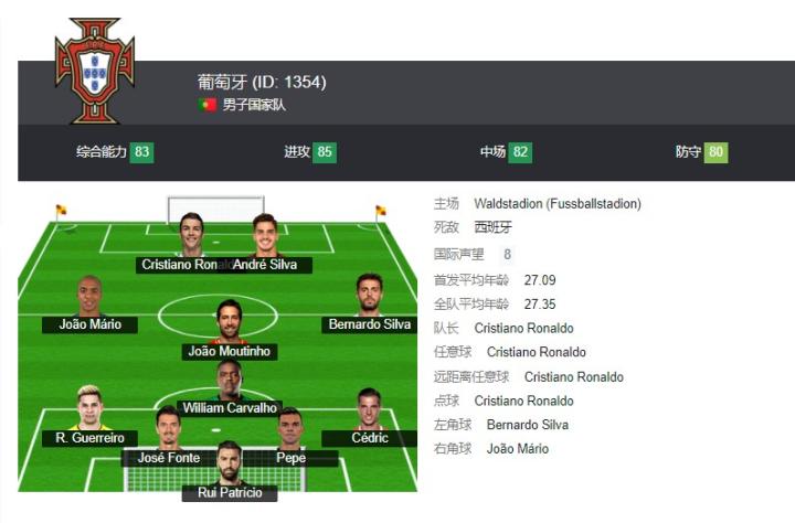 游戏中给出的葡萄牙首发阵容采取了双前锋的战术,A席负责策应、C罗完成最后一击,中场的四名球员中,强力兽腰威廉-卡瓦略坐镇单后腰完成拦截工作,若昂-马里奥、穆蒂尼奥和伯纳多-席尔瓦三位技术型中场平行站位进行组织,梳理球队的攻防节奏。后防线上有老将佩佩坐镇,门将则是欧洲杯上发挥神勇的帕特里西奥。总体来说攻守均衡,但中场的硬度可能稍差一些。