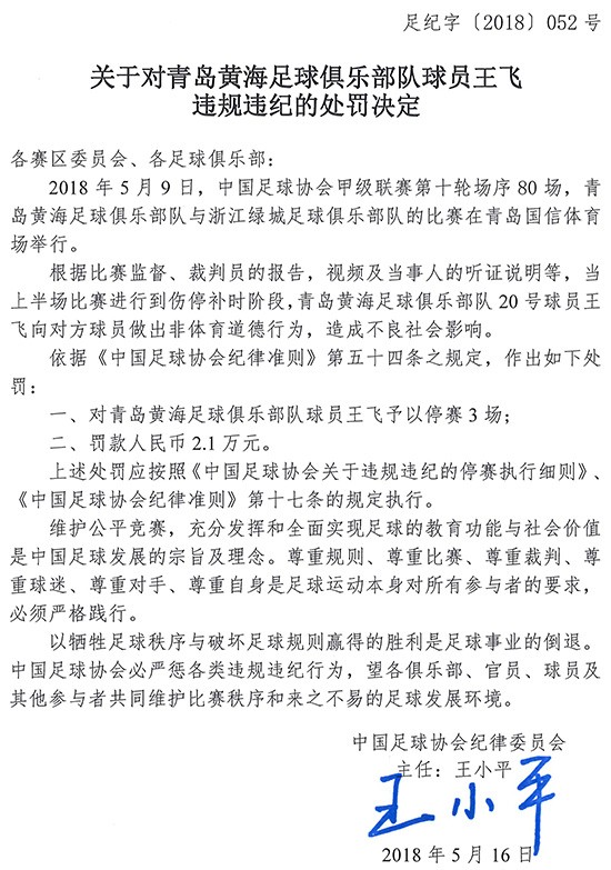 一、对青岛黄海足球俱乐部队球员王飞予以停赛3场;