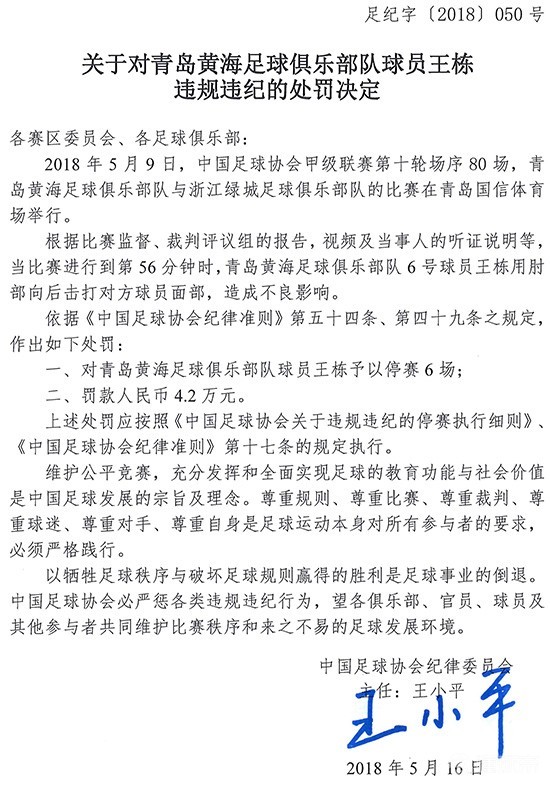 一、对青岛黄海足球俱乐部队球员王栋予以停赛6场;