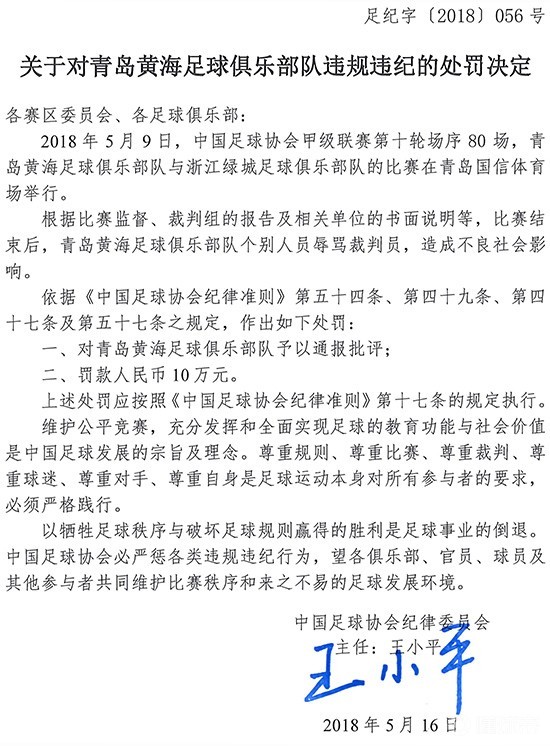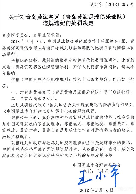一、对青岛黄海足球俱乐部队予以通报批评;