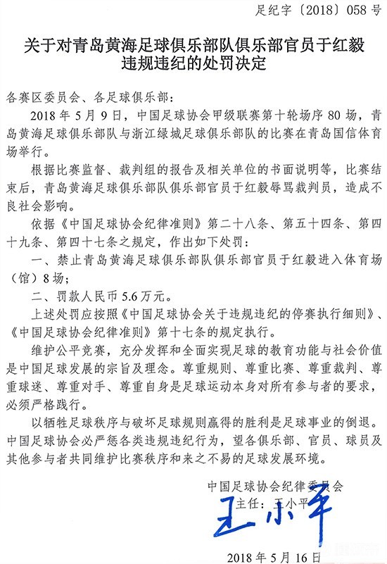 一、禁止青岛黄海足球俱乐部队俱乐部官员于红毅进入体育场馆8场;