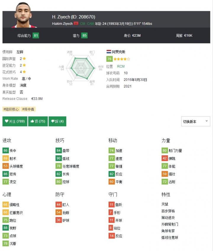 阿贾克斯队本赛季的年度最佳球员,同时也入选了荷甲的赛季最佳阵容的齐耶赫是俱乐部和国家队当之无愧的核心球员。本赛季登场的39场比赛全部首发,奉献了9球16次助攻的惊艳表现,在世界杯后更是极有可能登陆五大联赛。球员的运动能力不错,跑动范围大,能常常在球场的各个位置送出精妙的威胁球,是绝对的进攻枢纽。此外能边能中的特性也让球员的适应性更强,不会在某个区域内被限制死,这一点对于一名中场的核心球员来说尤为关键。