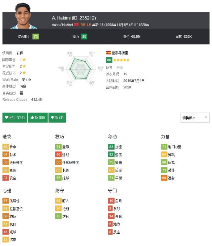 在游戏中阿什拉夫的总评只有73点,但潜力却高达85点。与现实里不同,游戏里球员的进攻属性并不突出,很少在进攻端所有贡献,但扎实的身体素质还是给了阿什拉夫未来很大的提升空间,83、82点的双速,75点的敏捷和80点的体能都还算出色,此外73、70点的铲抢技术在年轻球员中也很不错了。