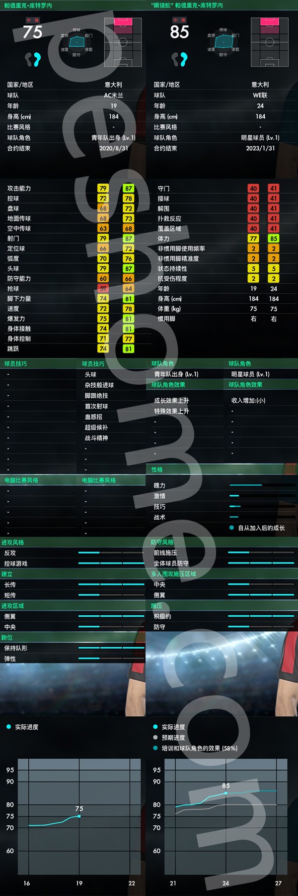 补充说明:继上赛季的多纳鲁马之后,AC米兰在本赛季又横空出世了库特罗内这名年轻出色的妖人;虽然米兰近年的成绩较之以往有了较大的落差,但意甲20多年的影响力使很多实况老玩家都对库特罗内在pes2018大师联赛里的成长状况非常关注。库特罗内这个类型的妖人算是久违了,除开经典和架空球员,这样身体厚实,能做支点,能站桩的现役妖人中锋,上一个我亲手练的竟然是pes2010的吉尼亚克,真是时光如梭,9年就这么过去了。相比吉尼亚克在pes2010的无所不能,个人能力本来就大幅受限的pes2018里,库特罗内作为一个依赖喂球的高中锋,个体杀伤力基本不用指望。库特罗内并不是只在禁区站桩,若非刻意为之,他更喜欢回撤拿球,但他没有伊布那样身上挂着几个人还能带球推进的实力,结合他将近70的防守抢球数据和实际表现,库特罗内更像是我个人认为高中锋里近几年硬实力最强的迭戈·科斯塔;库特罗内在禁区内和禁区前沿部分的静态对抗能力很强,身体素质过硬,肌肉和身板配上短袖上衣带手套的外貌非常man,对于对手后防线的干扰像极了前几年单枪匹马把水爷和武僧这两大世界前5中卫搅得不要不要的迭戈·科斯塔。虽然库特罗内的特点我非常喜欢,但他的硬实力并不是特别逆天,因为他的进球数量和一流锋线杀手有比较明显的差距,而且库特罗内比较喜欢回撤拿球,这效果实际上并不好,如果把他的风格特点设置成禁区之狐,让他多在禁区里作业,库特罗内的作用、进球数、能力值成长都能得到更大的提升,这种情况下库特罗内应该就会达到历史级的水平。