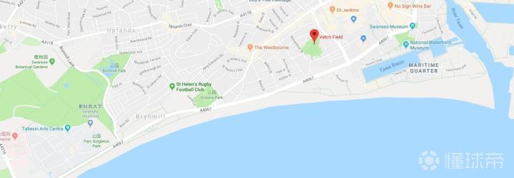上面这个图是豌豆田球场的大致位置。《Take Me to the Vetch field》里有一句歌词是这样的,“Take Me to the Vetch field,way down by the sea”。是的没错,豌豆田球场旧址就在海边不远的地方,靠近斯旺西湾。