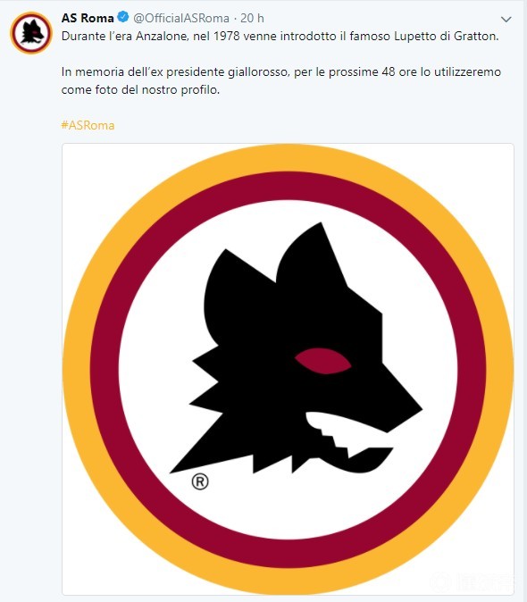 这个队徽的名字叫做“格拉顿小狼”(Lupetto di Gratton,lupetto是狼(lupo)的缩小词,出自著名插画家皮耶罗-格拉顿(Piero Gratton)之手),罗马俱乐部的所有社交媒体头像都将在未来48小时更换为这个经典队徽,以表达对前主席安扎罗内的悼念。