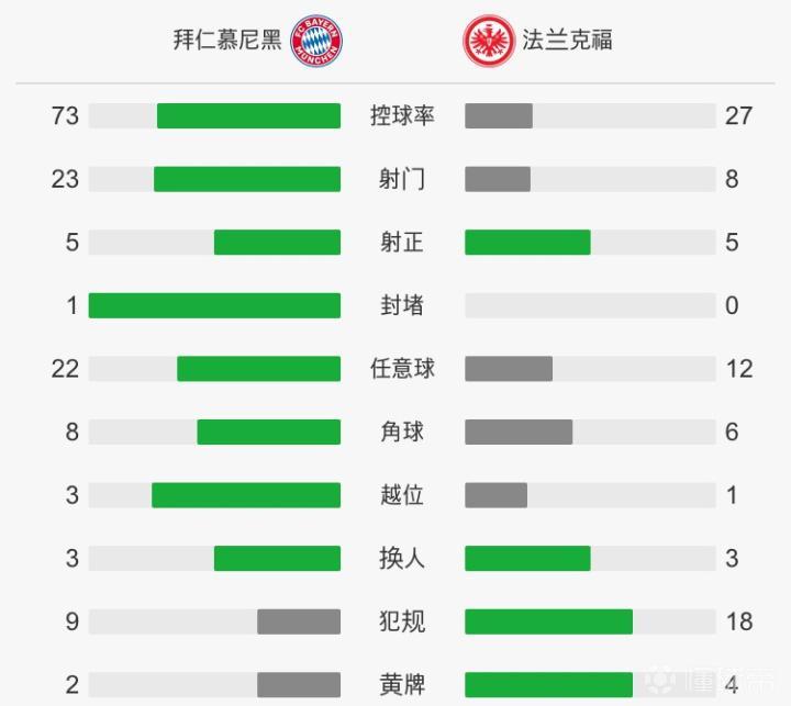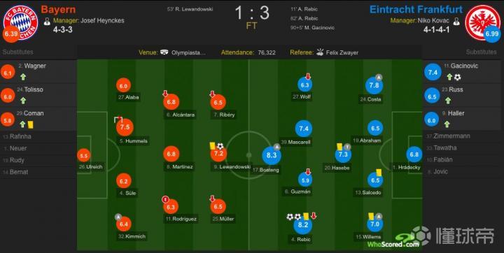 拜仁慕尼黑方面,胡梅尔斯获得全队最高评分;法兰克福方面,前锋博阿滕表现出色,获得全场最高评分。