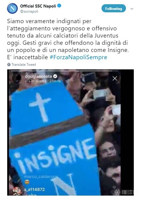 尤文图斯本赛季拿到了意甲冠军和意大利杯,在庆祝捧杯的活动期间,包括马图伊迪和道格拉斯-科斯塔在内的一些球员做Instagram视频直播,但在直播中出现了一些令人不快的图案,那不勒斯官方对此发推批评尤文球员。