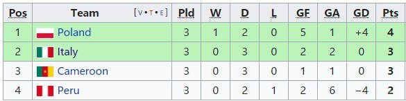 与波兰、秘鲁和喀麦隆同组的蓝衣军团小组赛三战全平只打进2球,即便这样他们还是成功小组出线——因为喀麦隆同样三战三平,进球数甚至比意大利还少一个。蓝衣军团逃过了本届杯赛的第一个危机。
