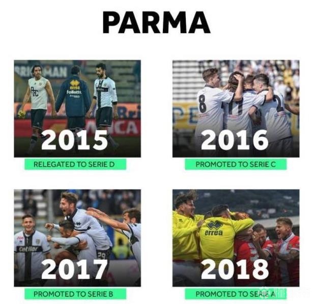由于财政问题,帕尔马在2015年被勒令降入了第四级别联赛,不过此后他们连续两年都成功升级。在本赛季拿到意乙联赛亚军后,帕尔马成为了意大利首支连续三年完成升级的球队。