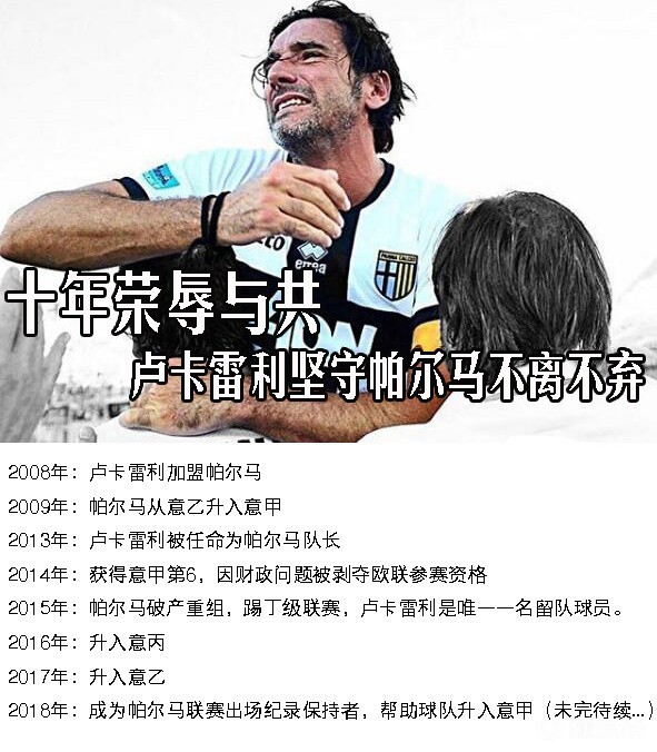 而在这场疯狂的庆祝中,帕尔马队长卢卡雷利更是难以控制自己的情绪,流下了热泪——连他自己也不敢相信眼前发生的一切。“(最后一刻)我看到看台上突然爆发出欢呼(弗罗西诺内被逼平的消息传来),所有人开始庆祝,那一瞬间我还不知道怎么回事……有这样一个美妙的结局,我没法控制自己。当初我曾经说过会帮助帕尔马返回意甲,我兑现了承诺。”